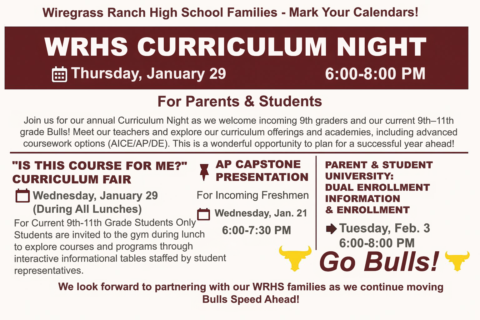 Curriculum Night 2026 Students, and Parents are invited to our annual Wiregrass Curriculum Night, Thursday January 29, 2026 6:00-8:00 pm See flyer for more information.
